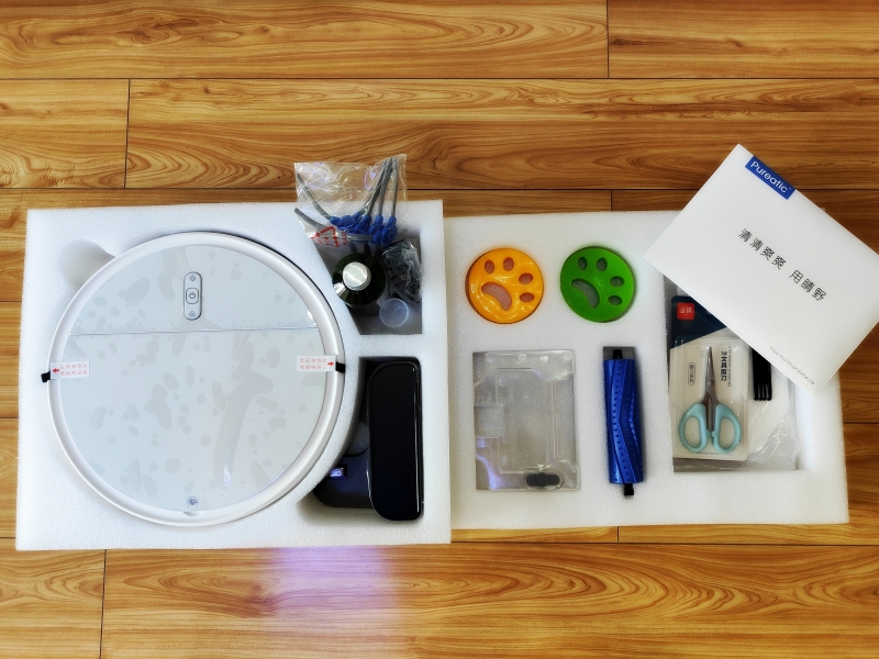 打开包装,除了主机、充电底座、电源适配器外,里面配件还有很多,主要是两类:一类是扫地机附件,包括边刷、防缠毛中刷、集尘袋、水箱、拖布、魔术贴和说明书;一类是宠物净毛宝专属清洁刷、剪刀、生物酶除臭液和粘毛器,针对猫狗宠物毛发掉落和异味问题专门做了安排。