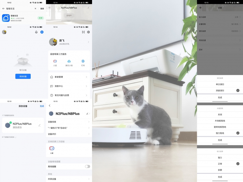 使用过程中,家里的小猫会对这个移动的圆盘充满好奇,有时守在一旁歪着头观察,有时有小爪试探着拨来拨去,甚至直接蹲在扫地机上当椅子坐。就是遇到语音提示突然响起,会吓它一跳,不过用过几次后它也就无所谓了,听而不闻。