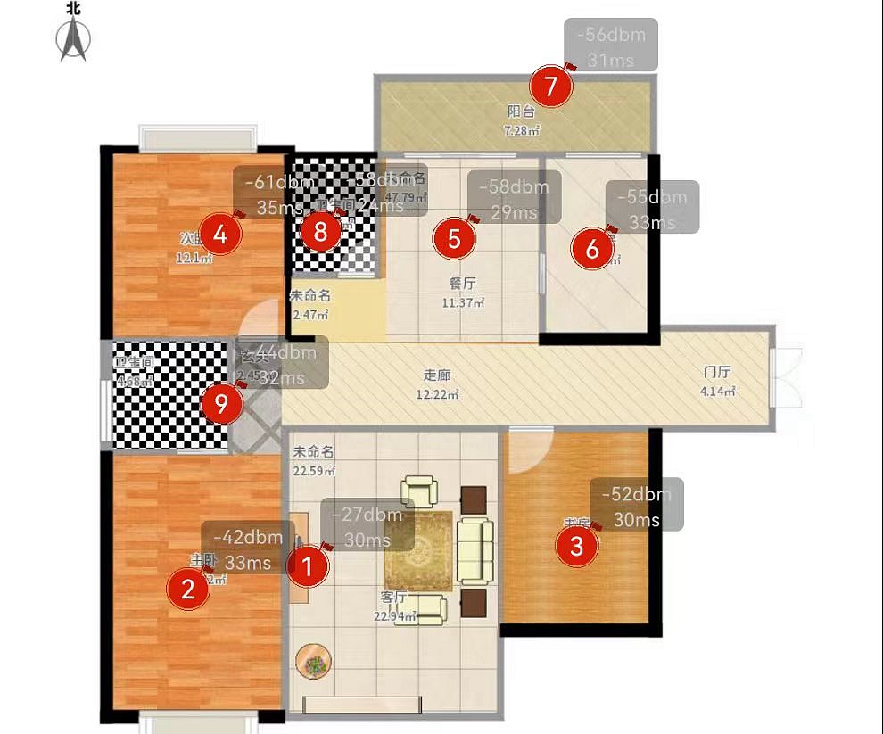 我家的房间面积为120平,属于三室两厅两卫。最近,孩子因为在家上网课,才发现他的卧室里网络信号有些差,上网课时会出现卡顿等现象。我就更换了家里的路由路,效果还是非常明显的,孩子上网课现在就非常流畅。我还通过测试软件对每个房间的信号强度和网络延迟进行了测试。最差的这个房间信号强度为-61dbm,网络延时也只有35ms,这个结果还是非常不错的。
