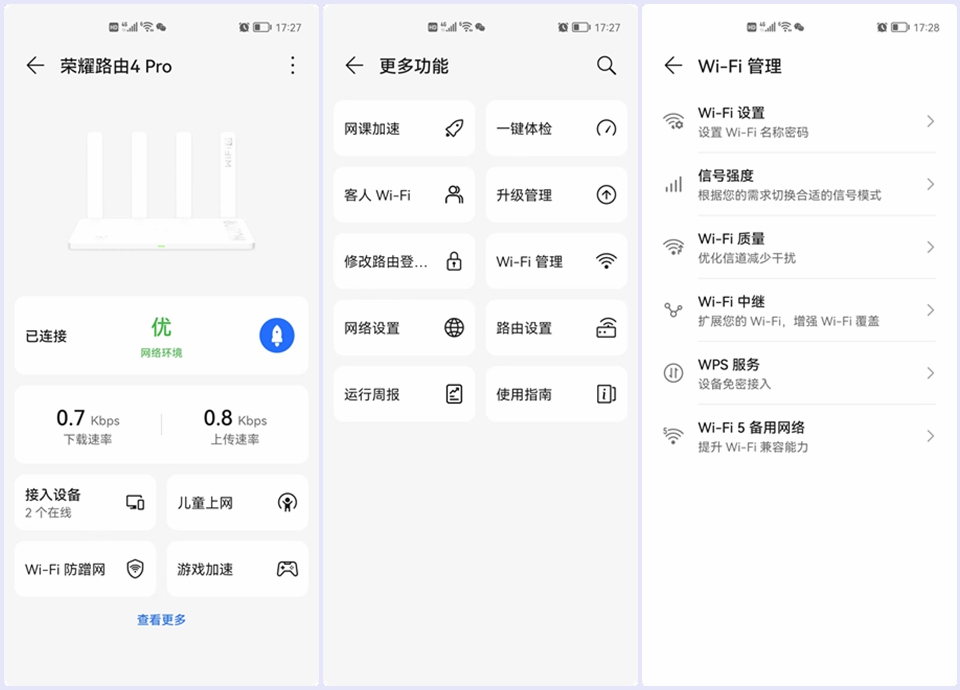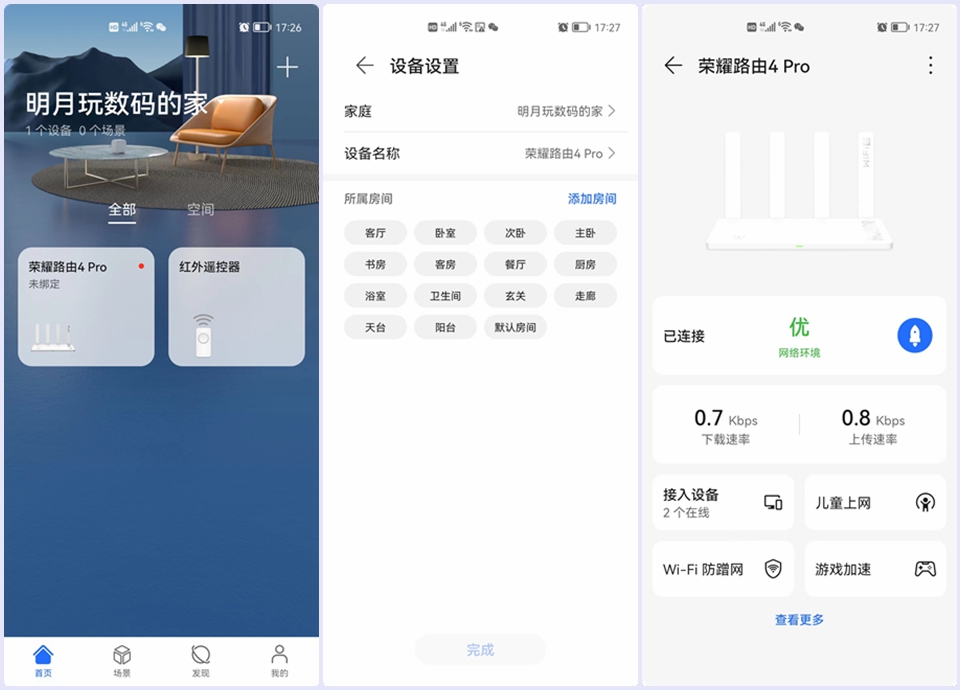 对于路由器后台的设置,可以通过电脑或手机都可以设置。如果使用荣耀智能空间APP,还可以实现远程控制路由器,可随时随地的了解家里的网络情况。比如管理孩子上网的儿童模式和游戏、网课加速等智能优化功能。
