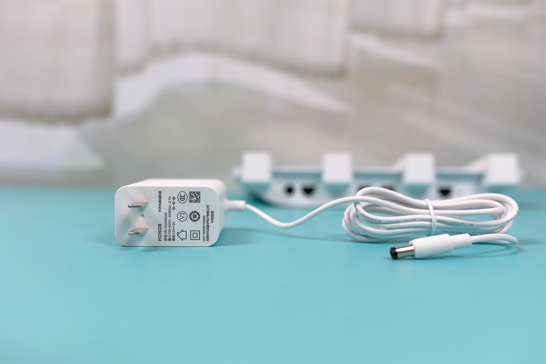 荣耀路由4 Pro采用的电源适配器为12V2A输出,这似乎要比3代的电源适配器颜值上更高了一些。