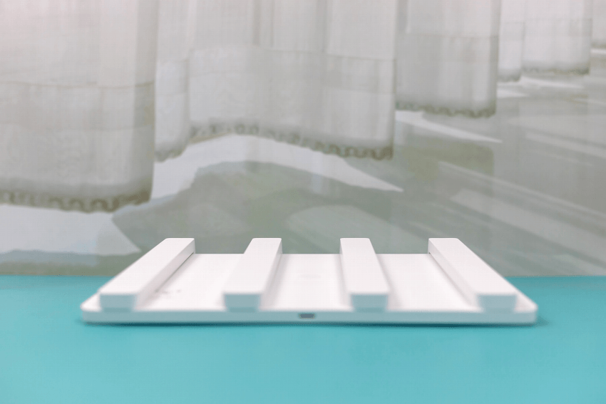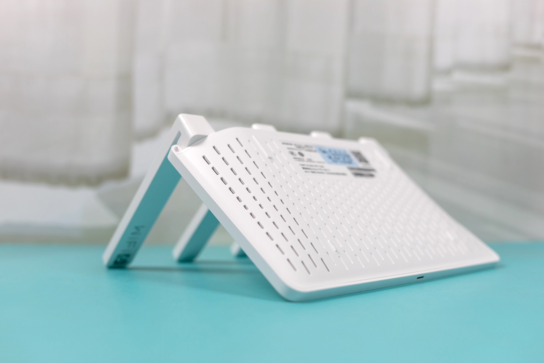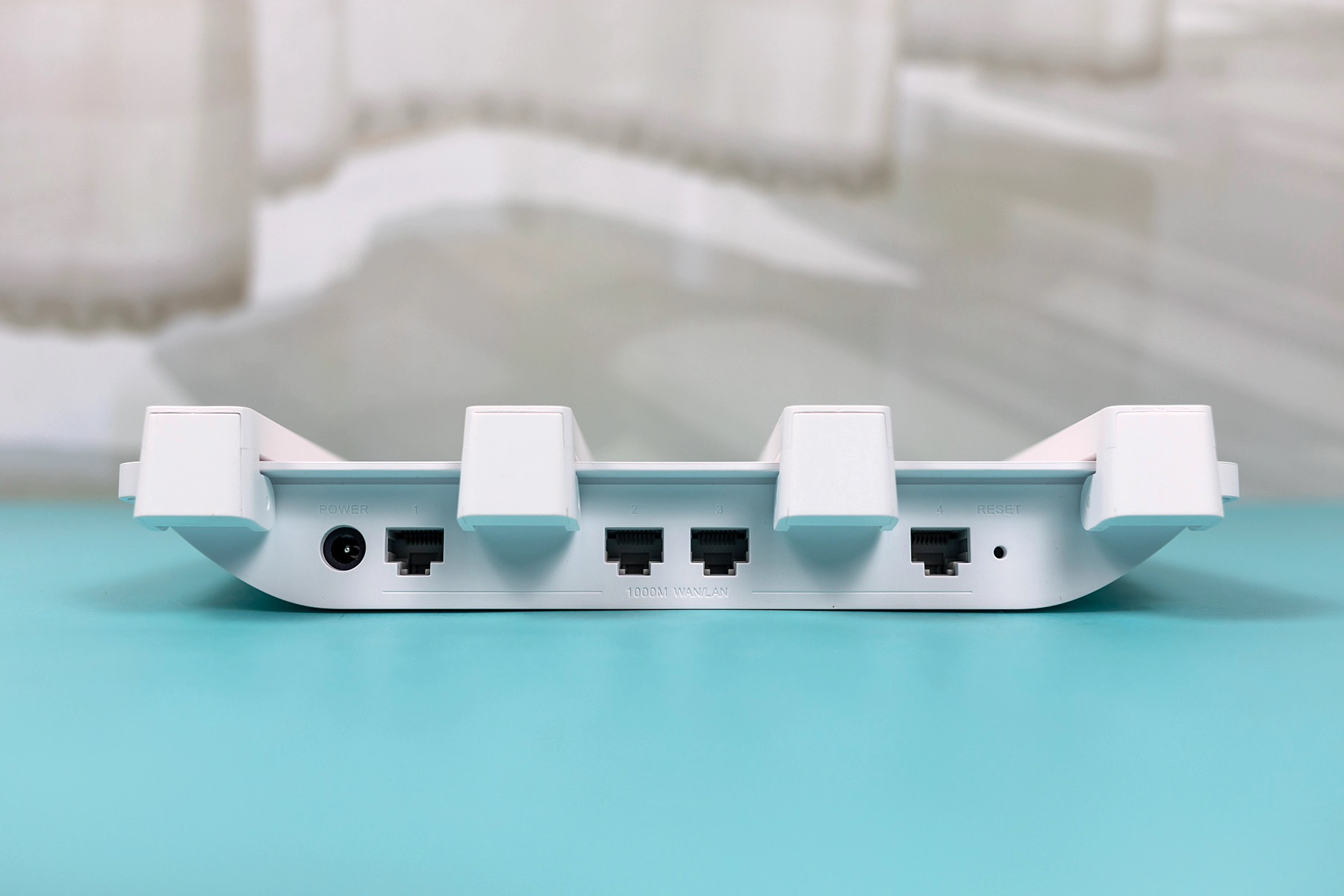 在路由器的底部,可以看到两侧面开有蜂窝式的散热孔,可以保证路由器长时间工作的散热效果。另外,路由器采用的斜面圆弧设计,在视觉上会显得路由器更加纤薄,在房间里也不会显得突兀。