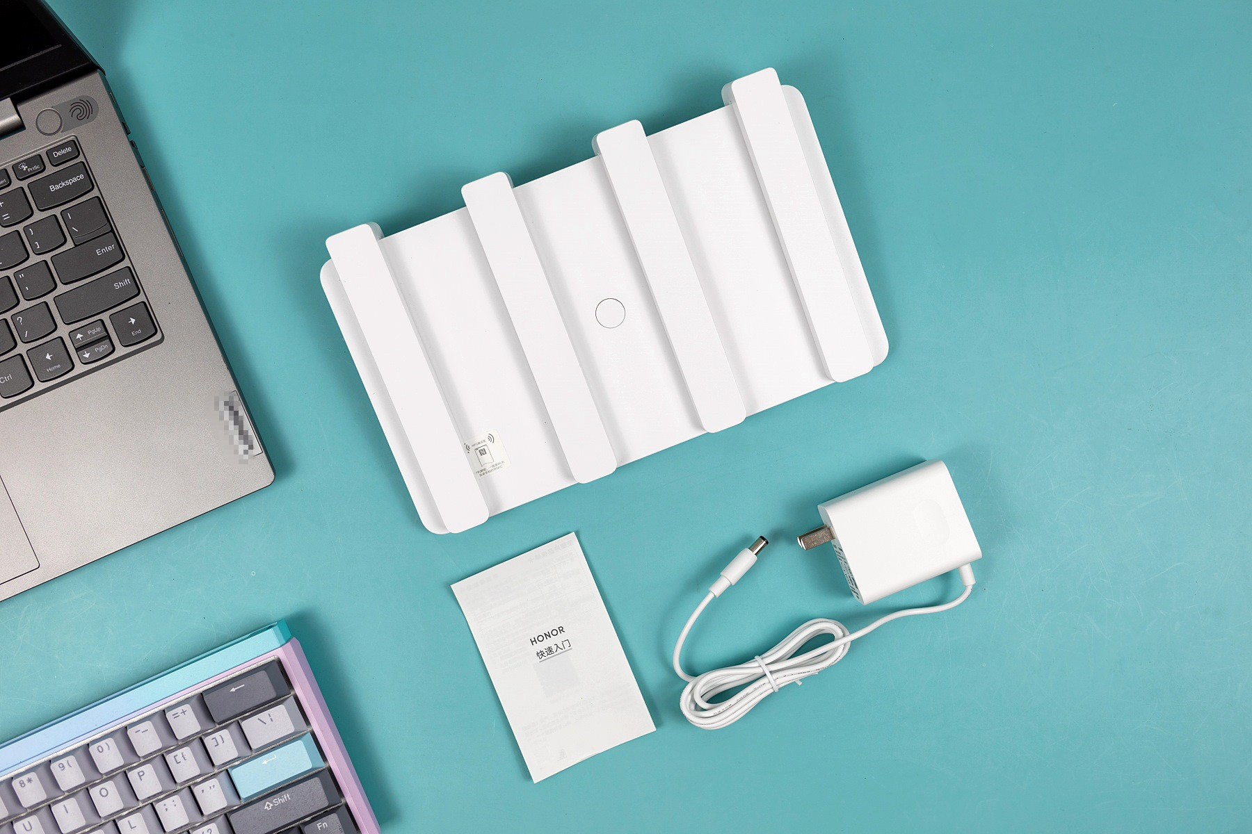 荣耀路由4 Pro全家福:除了路由器主机外,还有电源适配器和使用说明书。