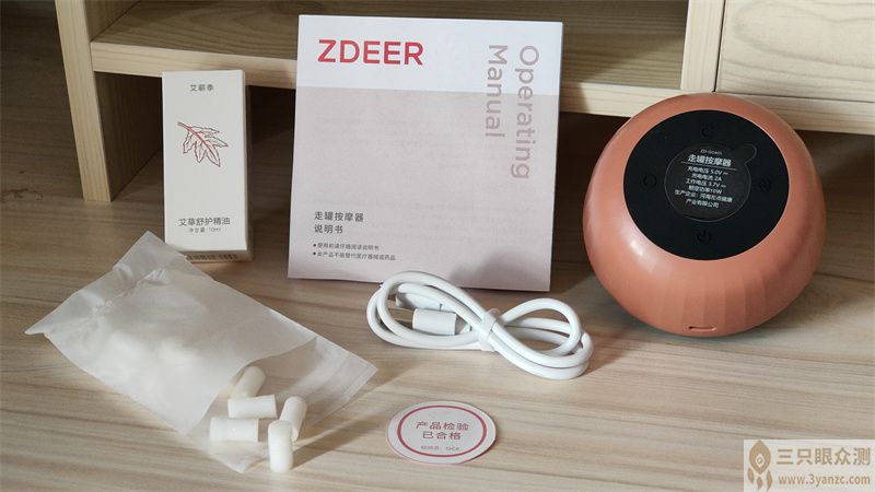 首先来看下存放主机的盒子有哪些产品,其中包含有:一台深橘色走罐按摩器主机、多开页的半彩说明书、合格证、一罐预制精油、充电线、一包吸附精油的棉条六个项目。