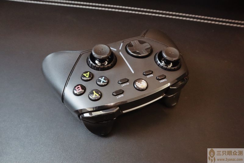 背面的按键有一个扳机行程调整的按钮,这个扳机所是三段式的,全档位适合玩赛车类游戏,中档则适合球类游戏,微档则比较适合操作最为精细的射击类游戏。还有两个自定义编程键,可以一键触发连锁招式,属于自定义编程范畴了。当然这些需要在驱动中设置,游戏驱动还可以设置RGB光源效果。